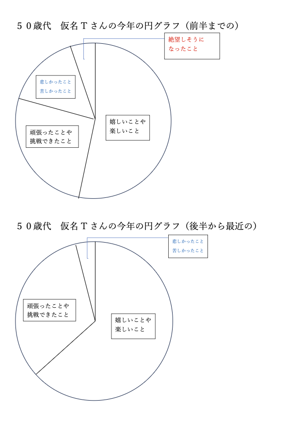 仮名Tさん 50代の今年の円グラフで「前半まで」と「後半から」の2つの円グラフです。
