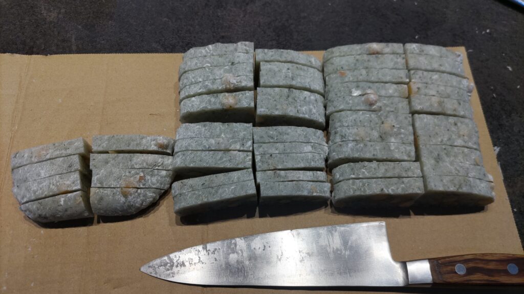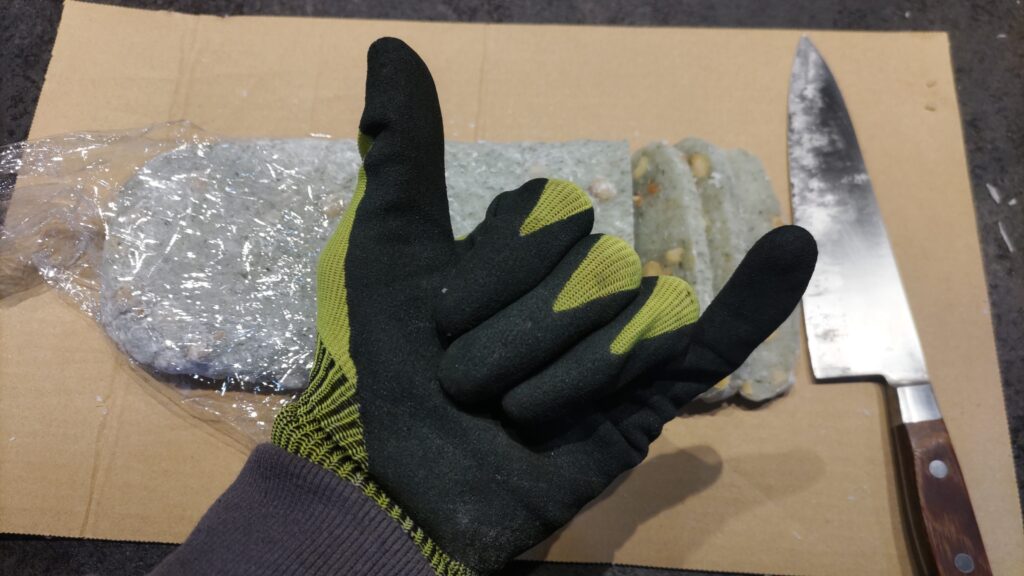 包丁で手が痛くなる私は作業手袋をつけて一気に裁断し、奥さんが袋に小分けにして冷凍してくれます。