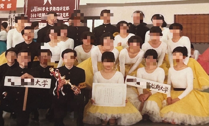 社交ダンスと言えば男性は燕尾服に女性はきらびやかなドレスを想像されるでしょうが、学生ですので男性は詰襟の学生服(もちろん黒色)女性は白のレオタードに円形のスカート(パニエというスカートをふくらませる為のインナー着用)とてもシンプルな服装でした。